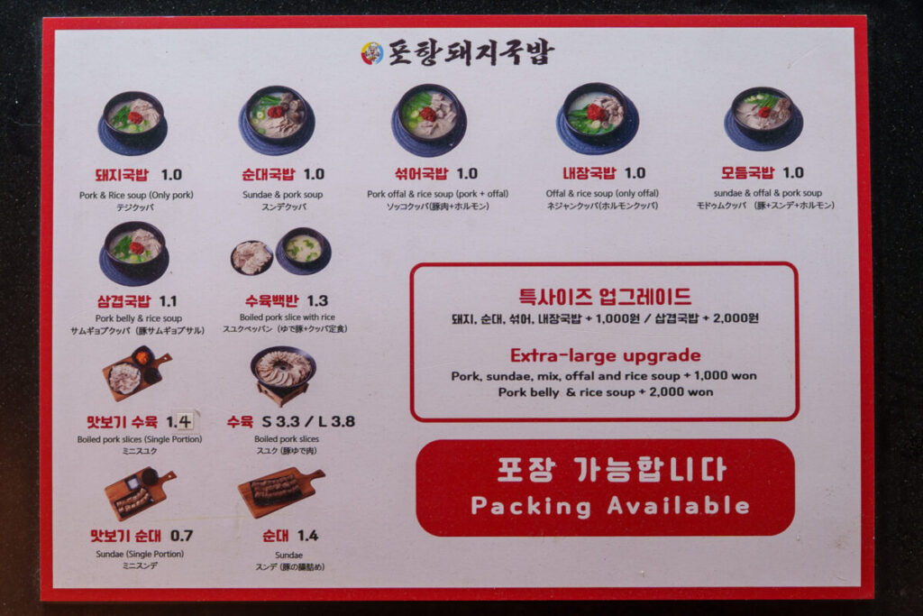 浦項デジクッパのメニューは、写真付きで、日本語訳もあります!!メニュー写真を指差して注文しましょう。