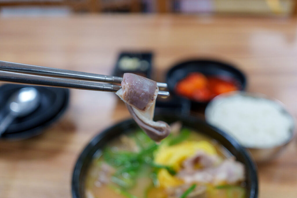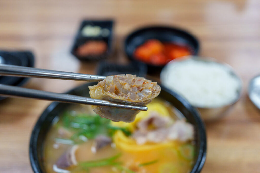 韓国では、お店ごとに特徴のあるスンデ(韓国ソーセージ)を食べる事ができますが、浦項デジクッパのスンデ(韓国ソーセージ)は、モチモチ食感が特徴です。そして、あっさり系なので、ボリューミーですが、ひとりでも一皿完食できてしまいます。