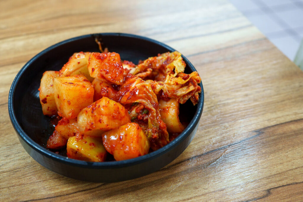 浦項デジクッパのキムチは、コク旨キムチ!!トゲトゲしい辛味がなくマイルドで、味噌感の厚みが加わった食べやすい味付けです。