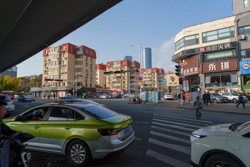 次の交差点に着きました。左を見ると、「万城広場(World Plaza)」と書かれた赤い文字が見えます。万城広場(World Plaza)は、Le Meridien Qingdao(ルメリディアン 青島)に隣接する大型商業施設です。