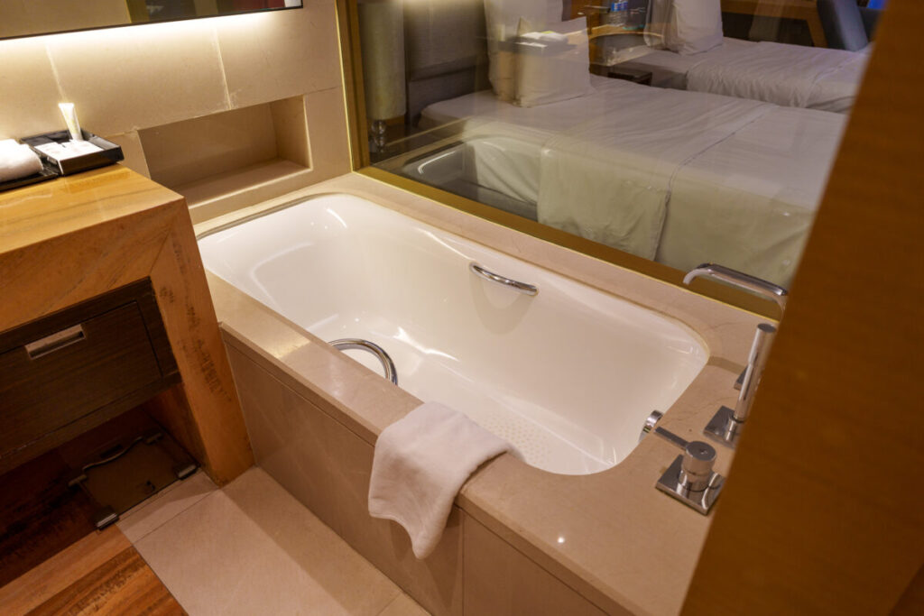 ガラス越しにバスルームが見えますが、ブラインドで仕切ることができます。
