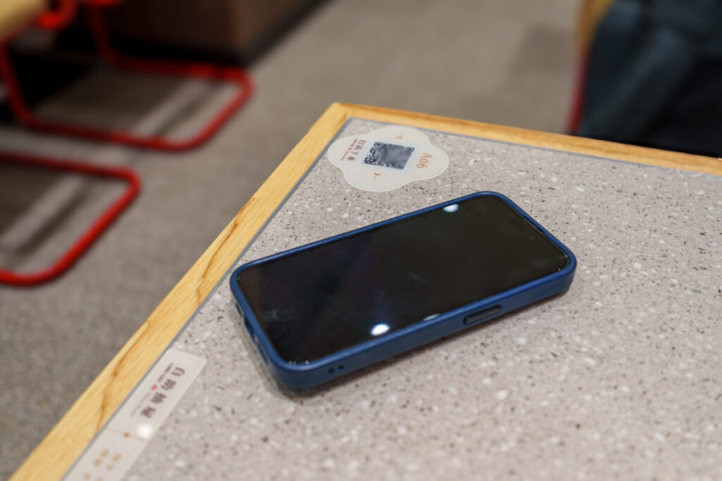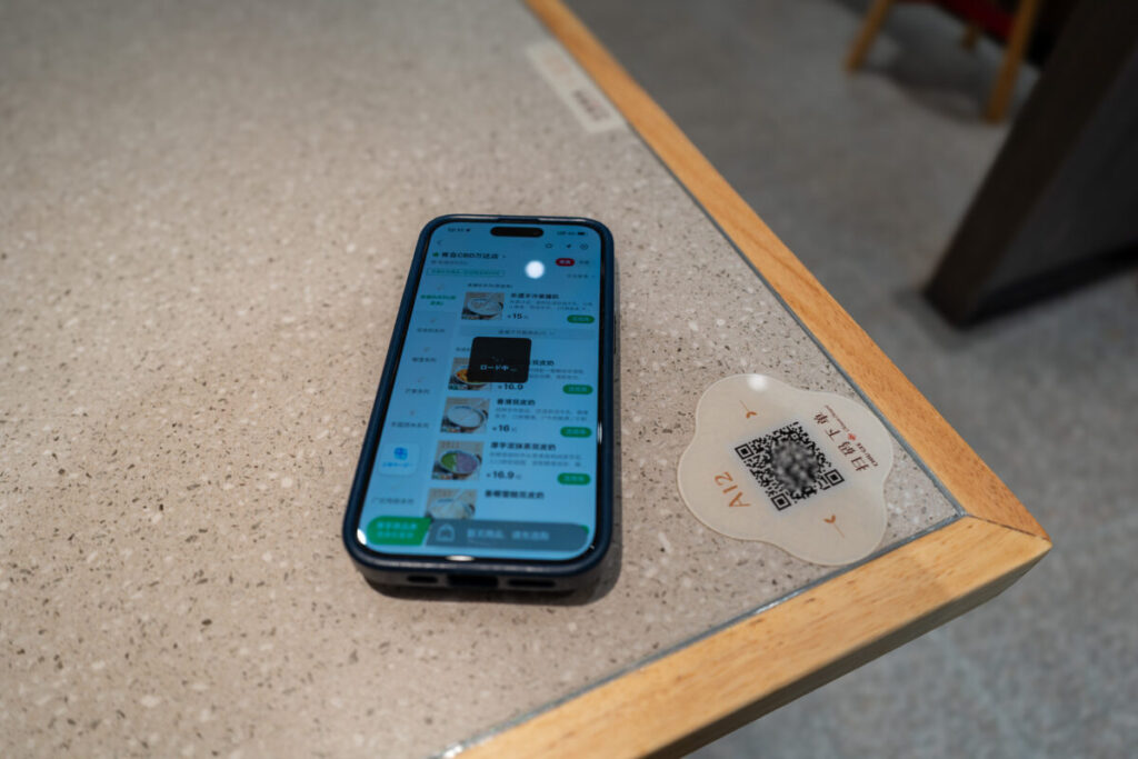 各テーブルには、QRコードがあるので、スマホアプリ「Alipay(アリペイ)」で読み込んで、注文します。