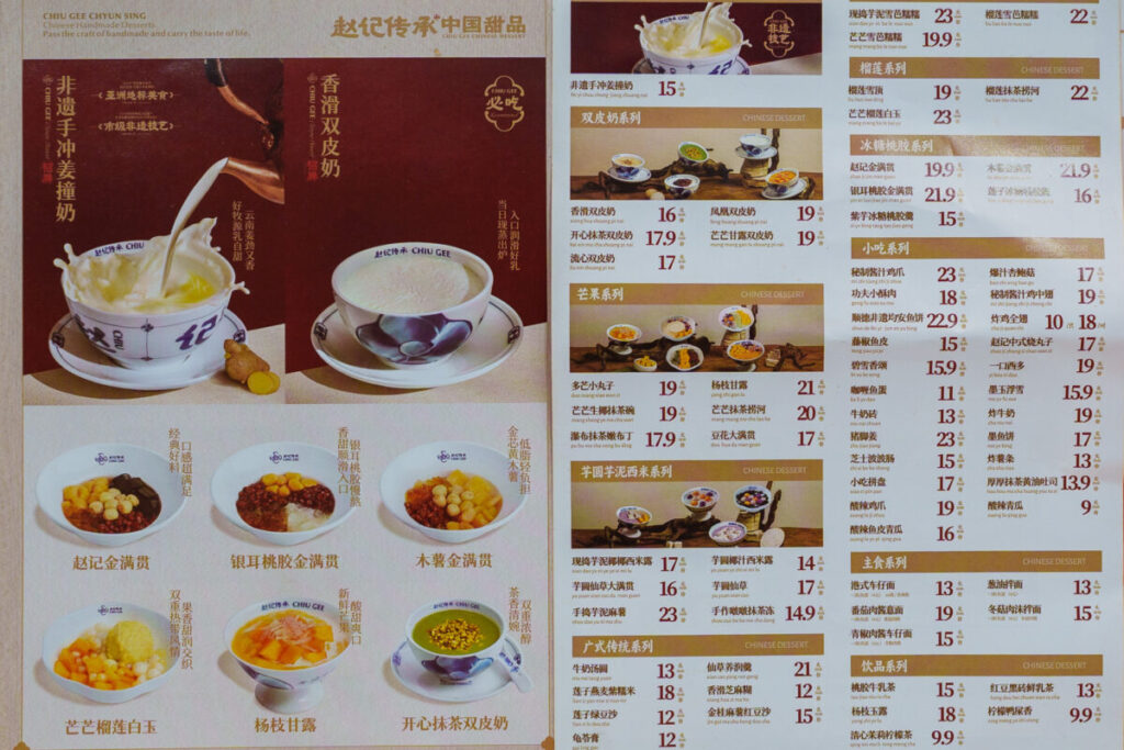 牛乳プリンの他、タロ芋団子など、様々なデザートがあります。どれも、だいたい20元(約439円)以下なので、色々と、注文してみましょう。軽食メニューもあります。