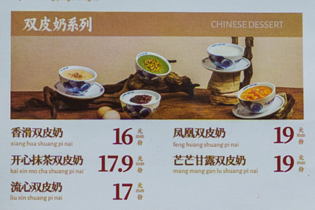 メニューの中で、「双皮奶(シュアンピーナイ)」と書かれているのが、ミルクプリンです。5種類あって迷ってしまいますが、おすすめを紹介します。