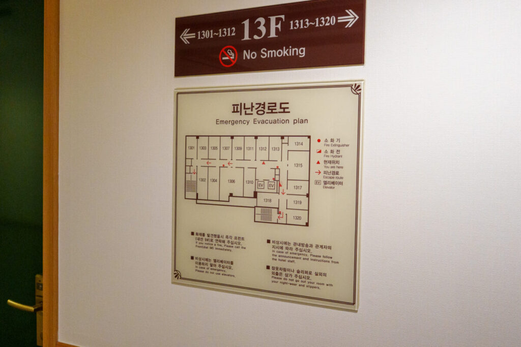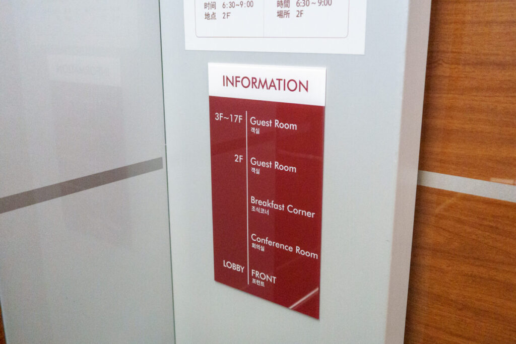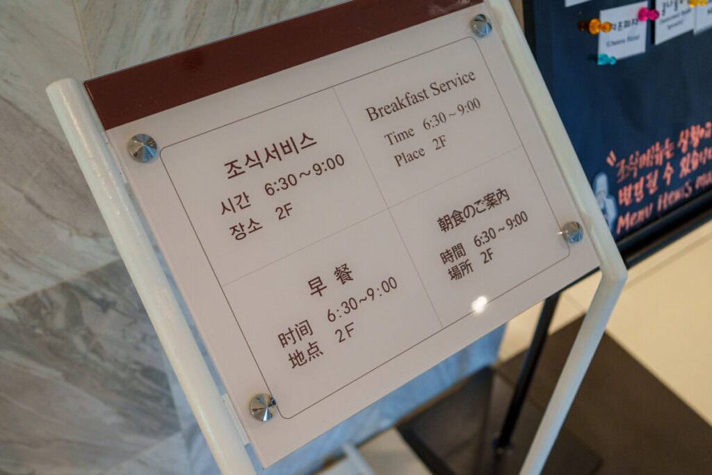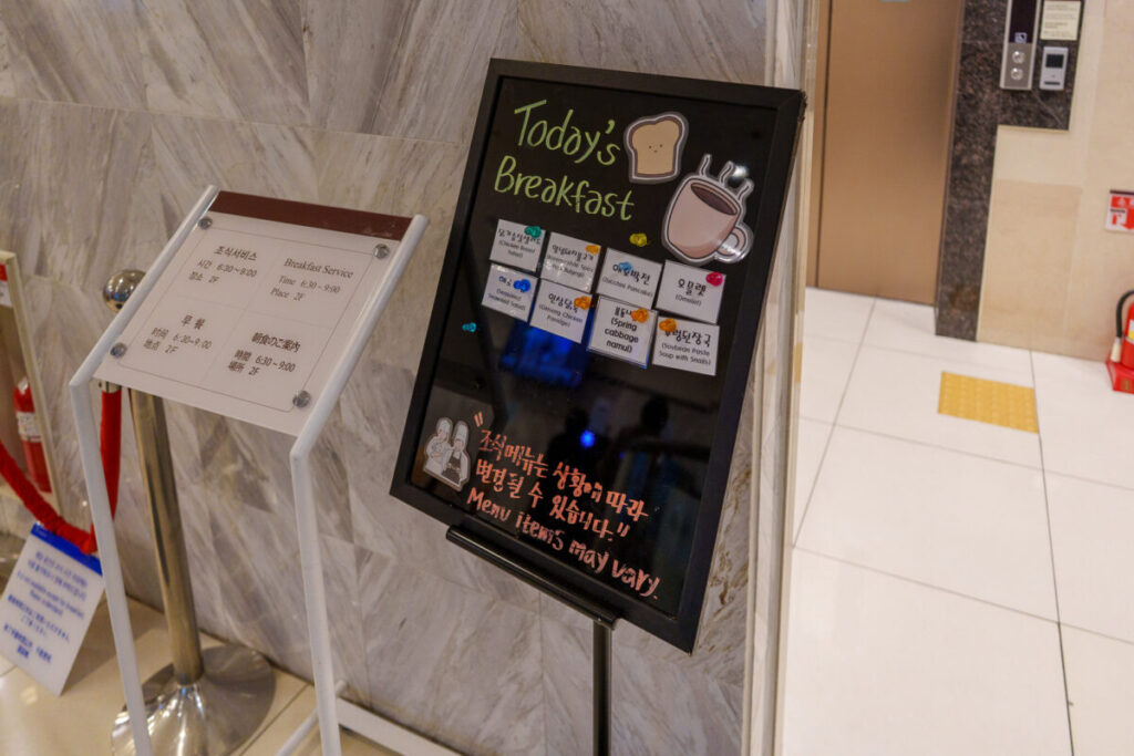 今日の朝食内容が掲示されています。英語と韓国語表記だけなのが残念。