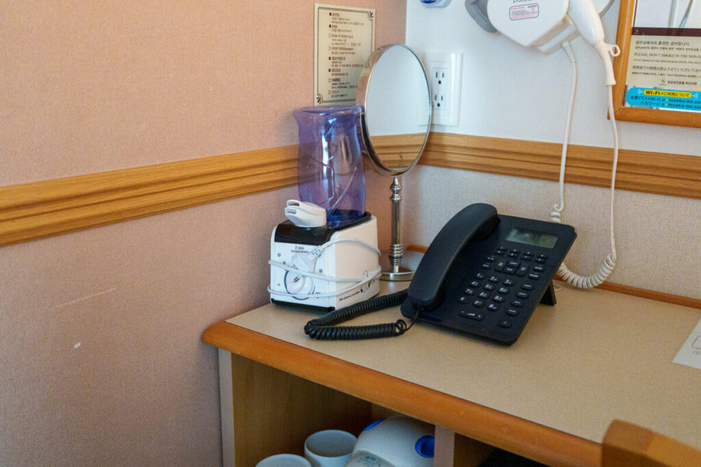 加湿器と鏡の奥にコンセントがあります。コンセントは、日本式なので、とても便利。
