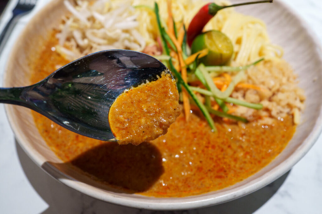 ココナッツミルクと野菜ペーストで甘みを出したマイルドなカレーです。スパイス感は控えめなので、年代問わず食べられるメニューです。具材に、生もやしと、きゅうり人参の千切りが入っているので、パスタサラダの様な感覚!!