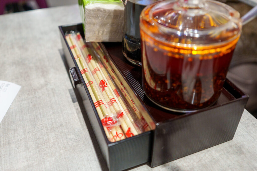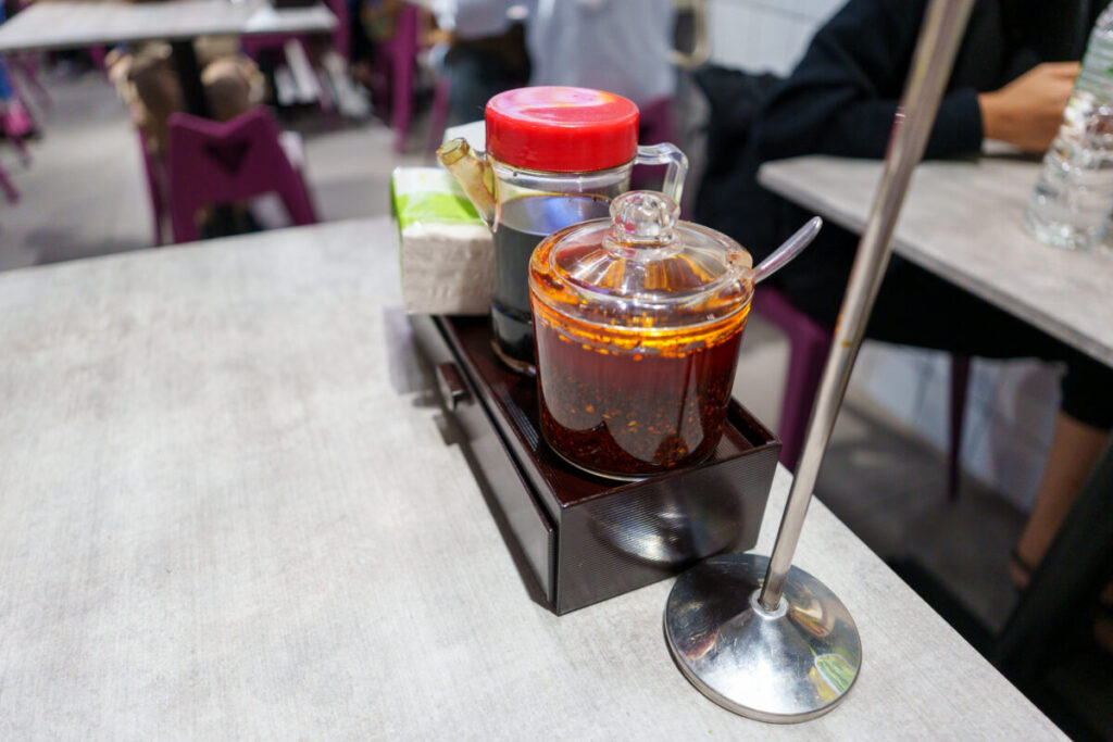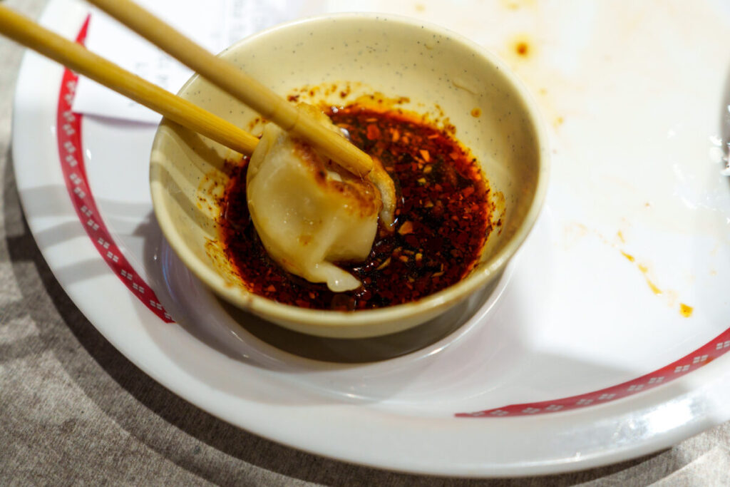 Mee Tarikでは、ラー油につけて、餃子を食べます。
