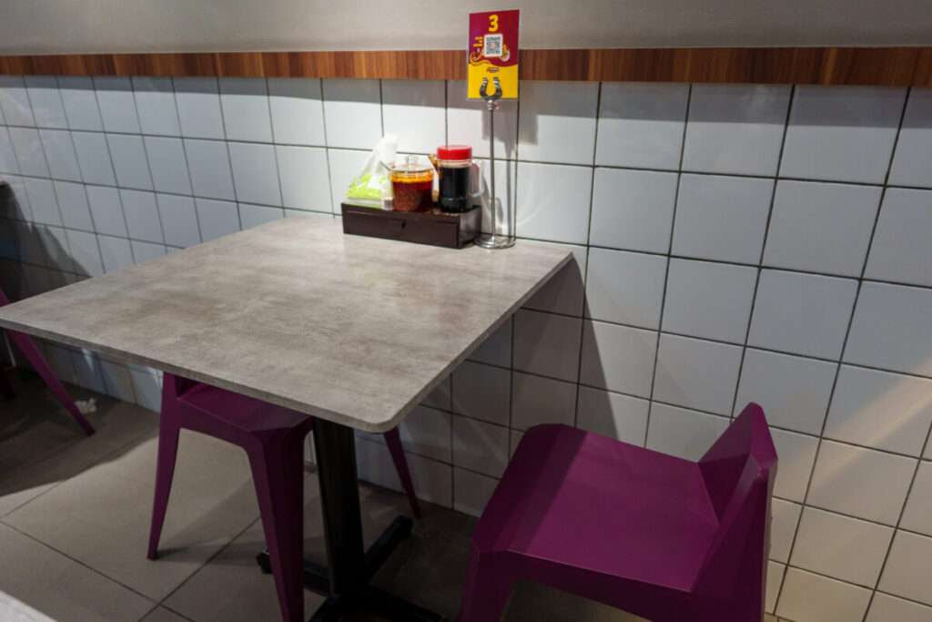 2名席中心で、各テーブルにあるQRコード札をスマホで読み込んで注文します。言葉の壁に悩まされることはありません。店員との会話は、ゼロです。
