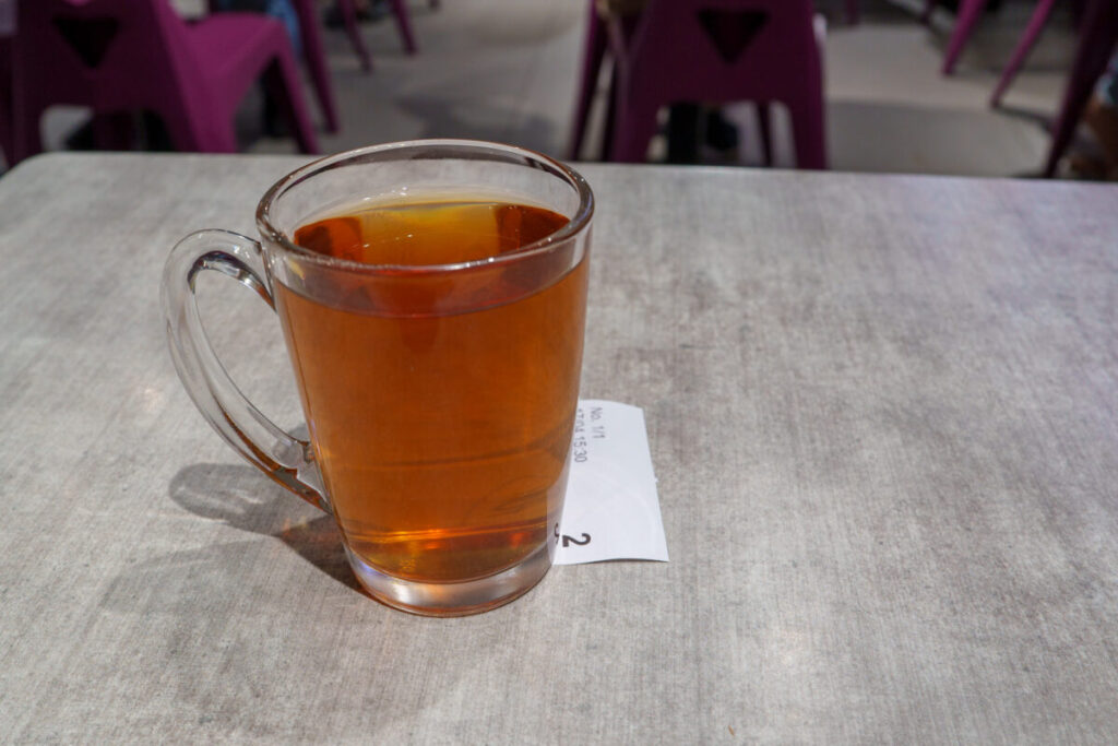 周囲のローカル民は、もっと豪華なドリンクを注文していますが、餃子の油を洗い流したかったので、注文しました。ホットorアイスが選べますが、東南アジアの氷は、汚染されている事があるので、ホットにしました。残念ながら、風味が全くないお茶です。お茶の味もしません。でも、価格が安いので、次回も注文します。