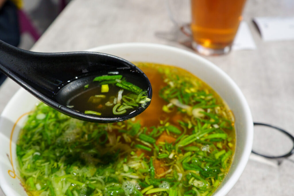 スープは、ベトナムのフォーのスープの様です。クセが無く、塩味ベースであっさりしていますが、畜肉の旨み、野菜の甘みを力強く感じます。昭和のラーメンの様にうっすら脂で蓋をしているので、麺との一体感があります。大量の刻みネギとパクチーが、食べ飽きさせない役割を果たしています。