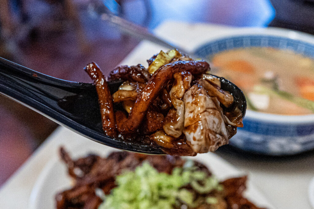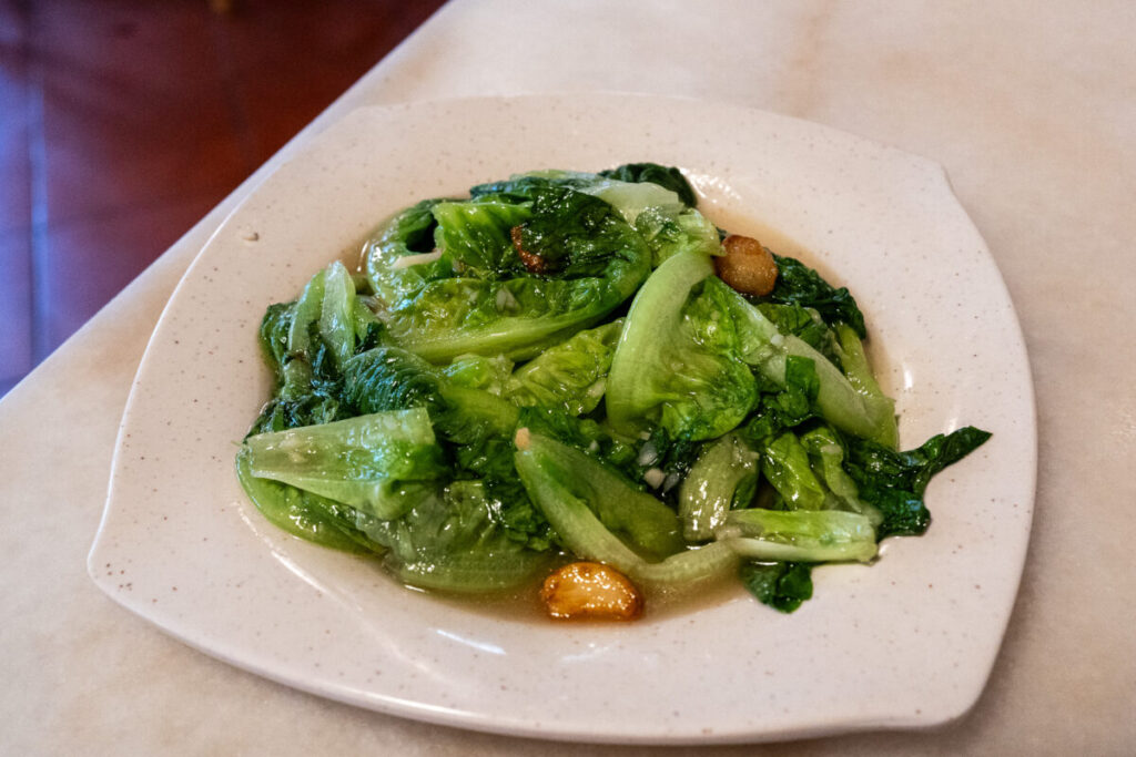 まるでオイル漬けの様な、大量の油を使った野菜炒めです。ローストされたニンニク風味が、全体を包んでいます。小サイズでも、レタス1個分くらいのボリュームがあります。福建麺(ホッケンミー)に乗せて食べると、レタスのシャキシャキ感とガーリック風味が薬味となり、味変できます。