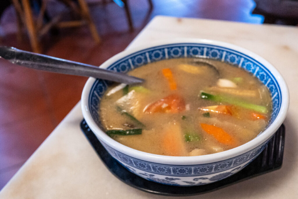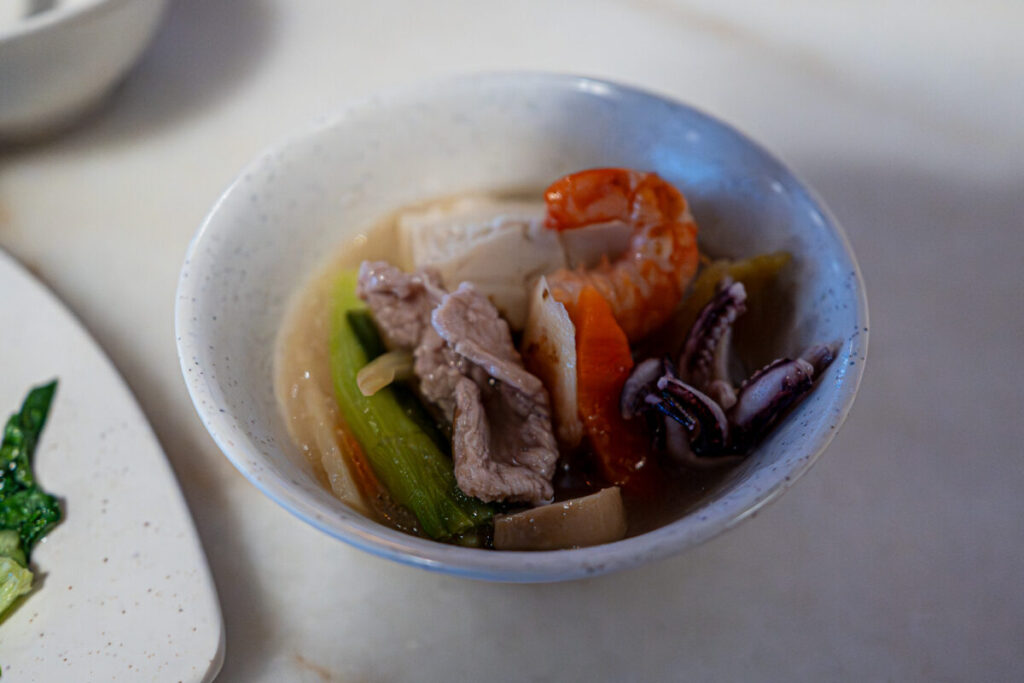豆腐、エビ、豚肉、イカ下足、野菜など、いろいろな具材が入っています。スープには、トマトの様な酸味があり、福建麺(ホッケンミー)の油を洗い流してくれます。