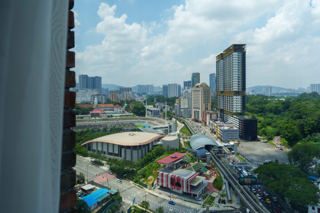 窓からは、モノレールのマハラジャレラ駅が見えます。