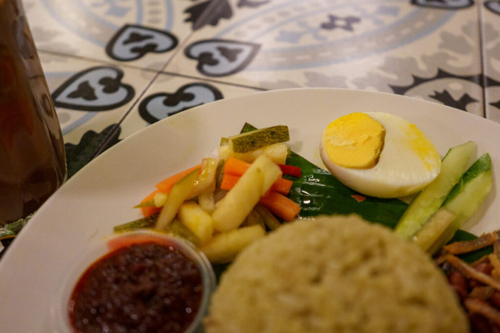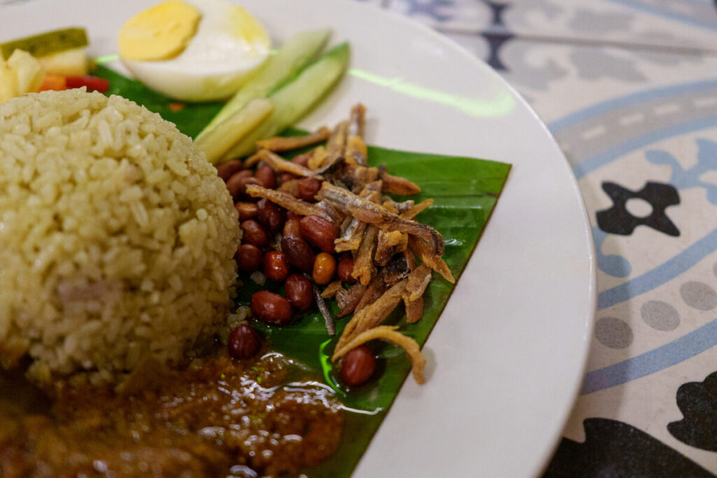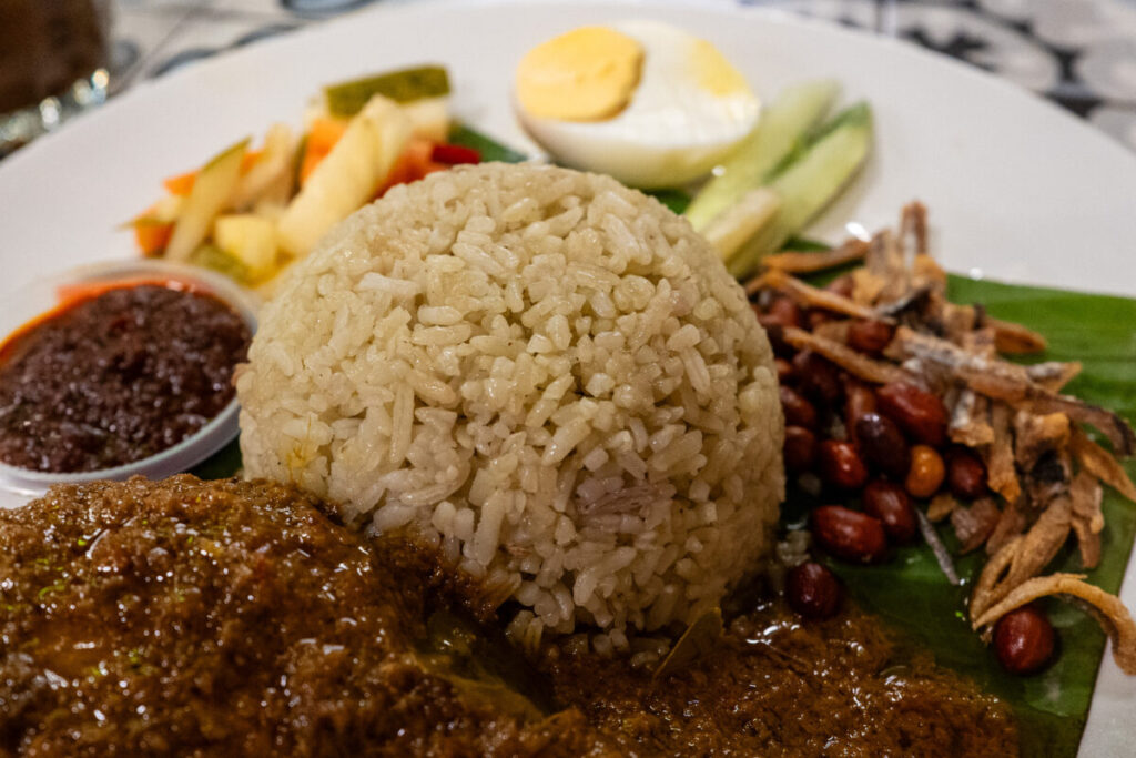 ナシレマッです。ココナッツミルクで炊いたごはんは、意外にも素朴で、レモングラスの香りがありますが、米本来の味わいが感じられます。