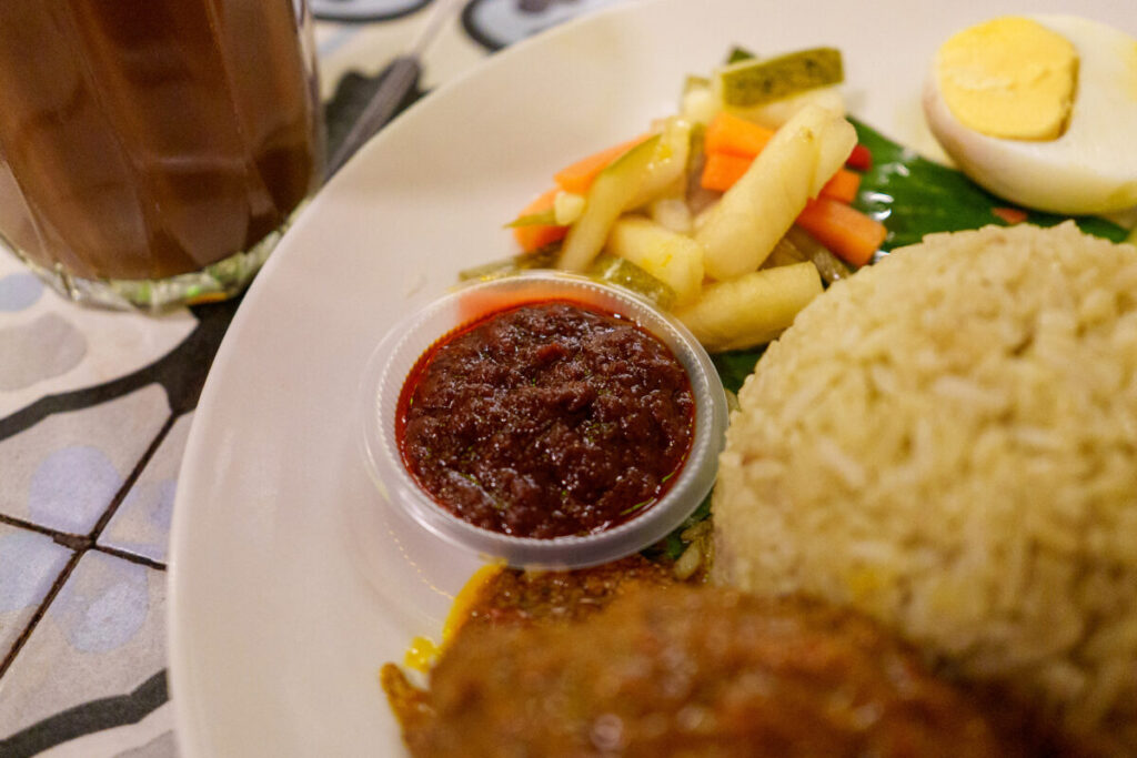 サンバルソースは、唐辛子ベースの野菜ペーストで、ナンプラーの様な魚介の香りもあります。加えれば加えるほど、辛味が増していきます。