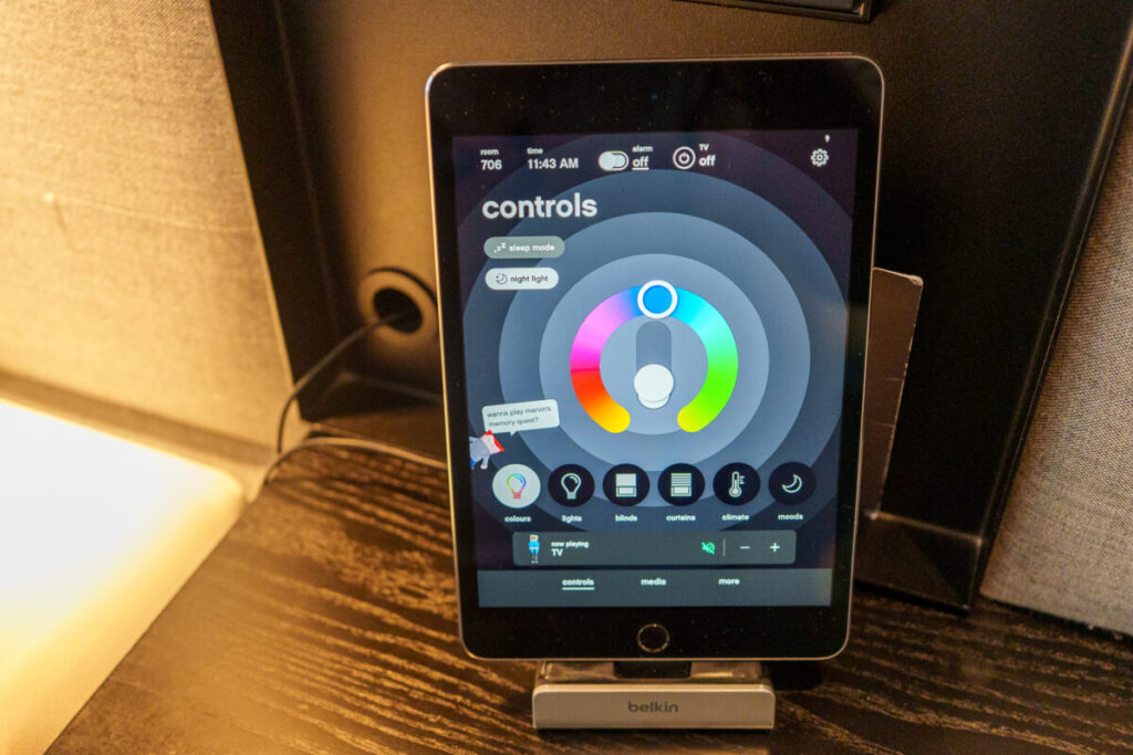 エアコンの温度設定などは、デスクのタブレットでを行います。